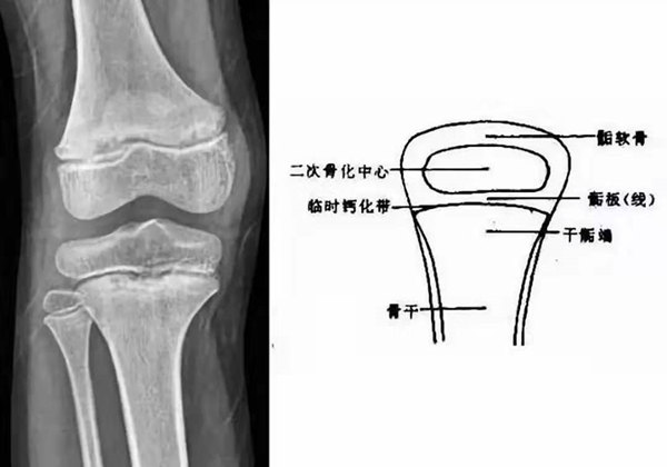 我們都知道,人體的高矮是由骨骼的生長發育決定的,特別是下肢長骨。長骨呈長管狀,在長骨的兩端有一種專管骨骼生長的骺軟骨,它與干骺端之間有一盤狀軟骨結構稱為骺板(線),在幼兒的X光片上表現為一條較寬的透光帶。 (見下圖)