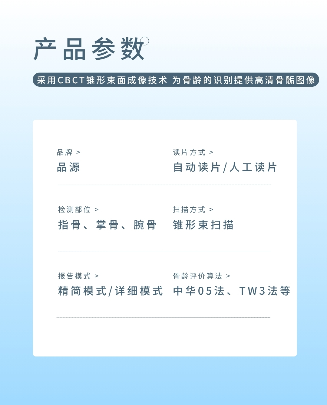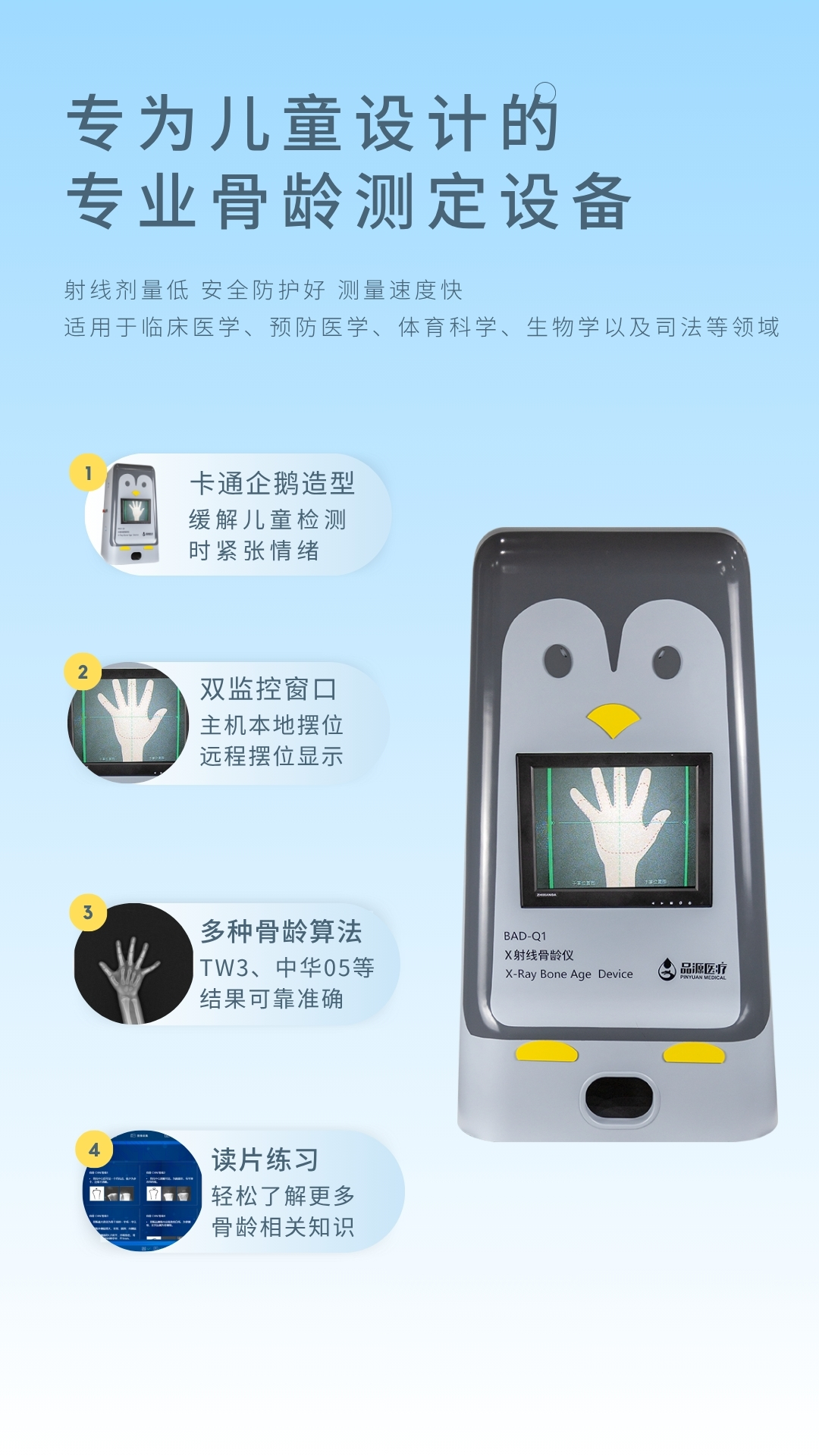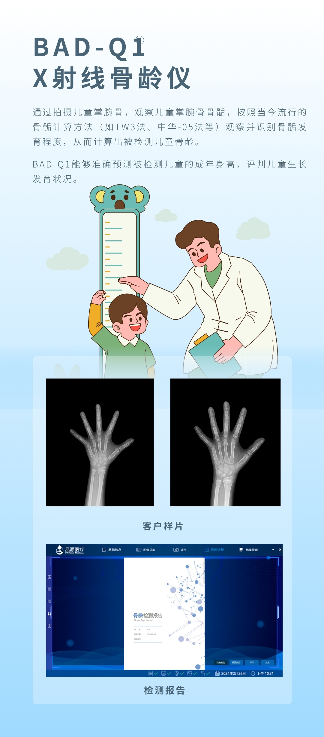 產(chǎn)品適用兒童醫(yī)院、婦幼保健院、各級(jí)醫(yī)院的兒保科,體育研究機(jī)構(gòu),體育學(xué)校等,用于對(duì)青少年骨齡檢測(cè)與體格發(fā)育評(píng)價(jià)。