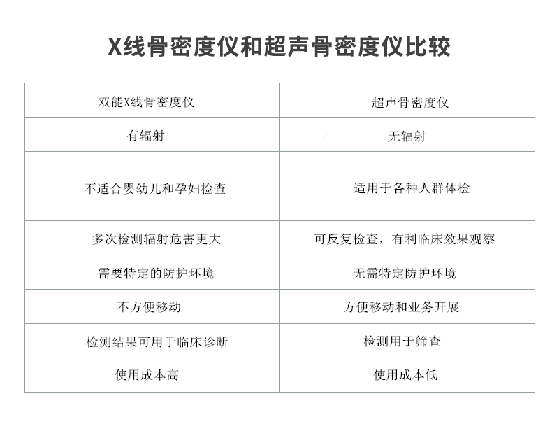 ■ 目前用于臨床的骨密度測(cè)量?jī)x器有兩大類,即雙能X線和超聲骨密度測(cè)試,雙能X線骨密度儀是行業(yè)檢測(cè)標(biāo)準(zhǔn),準(zhǔn)確度高,但從安全性方面超聲骨密度儀有明顯優(yōu)勢(shì),這對(duì)人們?nèi)找婷舾械妮椛浔Wo(hù)非常重要,比較如下。